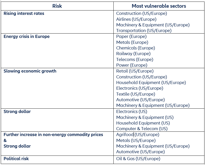 - As a result, countries, sectors and firms now face different challenges. The energy crisis could be a major blow in Europe for energy-intensive sectors (Power, Paper, Metals, Railways, Chemicals etc.) while the strong dollar could harm exporting sectors in the US. Discretionary spending and construction are also at risk while energy should continue to fare well – although it is at risk of facing political action (e.g. a “superprofit” tax).