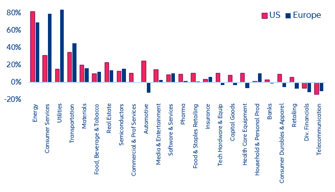 Most companies, regions and sectors suffered from the Covid-19 crisis and benefited from the release of pent-up demand. However, in 2022, sectors are now facing very specific challenges. Cash positions and debt also underline different dynamics. While the risk of an economic slowdown is bad news for corporates on both sides of the Atlantic, cyclical sectors are more exposed (e.g. retail, textiles, construction). The energy crisis is a European topic, with firms facing existential threats as they worry about access to energy. In the US, however, it is mostly an input cost topic that could push up expenses. Similarly, rising interest rates will hit highly leveraged sectors harder (e.g. construction, airlines). And the strong dollar is mostly a hurdle for US exporting sectors (e.g. household equipment, machinery & equipment). Finally, the oil & gas sector alone is facing political pressures, with potentially higher taxes in Europe to fund fiscal measures and growing pressure from the Biden Administration in the US to invest in refining capacity. The Power sector in Europe is under tremendous pressure however it is and will be heavily supported by policy as the sector is too important to fail.