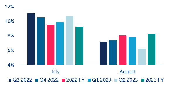 Figure 3: S&P 500 profit-growth estimates for 2022 and 2023 (July vs August consensus)