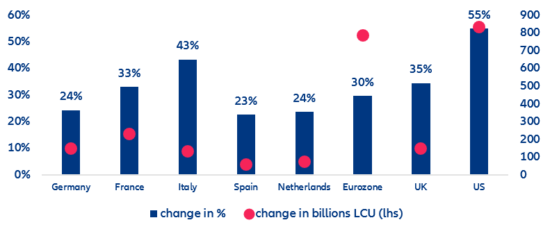 This context is pressuring firms to remain highly leveraged. Despite the decrease in debt ratios posted in Q1 2022, largely due to growth in nominal GDP, financial debt ratios still exceed pre-pandemic levels (see Figure 7). In absolute terms, the financial debt of NFCs has hit new records in most countries, notably Germany (EUR1,860bn), France (EUR2,074bn) and the US (USD12,138bn – see Figure 8).