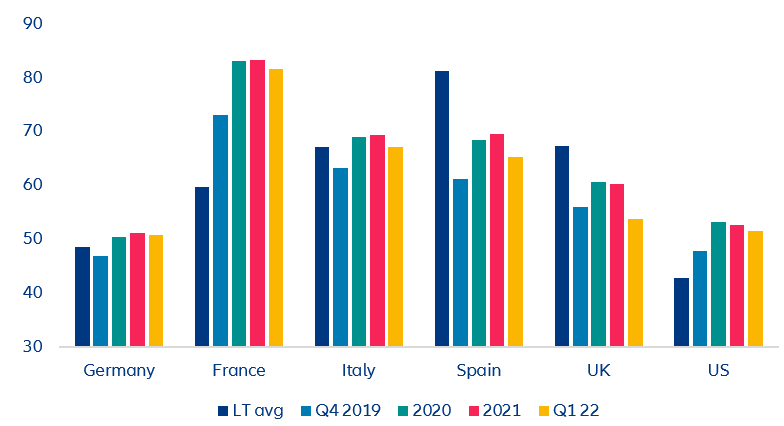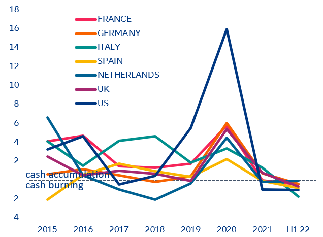 However, part of these increases in cash balances comes from new bank loans taken out either proactively or defensively. De facto, changes in net cash positions, measured by the difference between NFC deposits and new loans, decelerated noticeably from 2020 to 2021 and again in H1 2022. For the top five markets of the Eurozone, the momentum dropped to 2% in H1 2022, from 7% in 2021 and 14% in 2020. The outcome is similar for the UK (1%, 14% and 19%, respectively) and slightly worse for the US (0%, 6% and 23% respectively). For most countries, this means that the increase in economic activity already started to generate a smaller increase in cash positions. Indeed, our cash-burning index[1] turned negative in H1 2022 in the UK and Germany, and confirmed the negative turn begun in 2021 in France, Spain, the Netherlands and the US (see Figure 5).