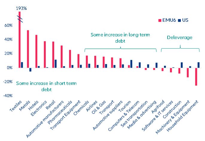 Moreover, as interest rates are rising, interest expenses are also intensifying. Between Q1 and Q2, interest expenses rose quite sharply for firms in the six largest Eurozone economies (+16% for our panel). Notably, they almost tripled for the textile sector, and increased by about +50% for metals, electronics and hotels. In the US, the rise has been less pronounced (average of +3%), except for the machinery and equipment sector, which faced a +56% increase. However, when adjusting for changes in long-term debt, the picture looks very different: We see that the rise in interest expenses in Europe is mostly driven by WCR while in the US it is mostly due to an increase in longer-term debt (see Figure 9). Note also that the household equipment sector in the Eurozone has started to deleverage, signaling a slowdown in activity and demand for durable goods.