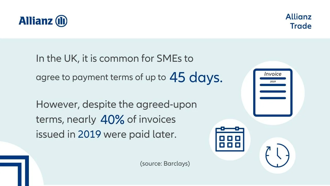 In the UK, SMEs agree up to 45-day payment terms from completion of work or delivery of goods. Despite this, almost 40% of invoices issued in 2019 were paid late (Source: Barclays).