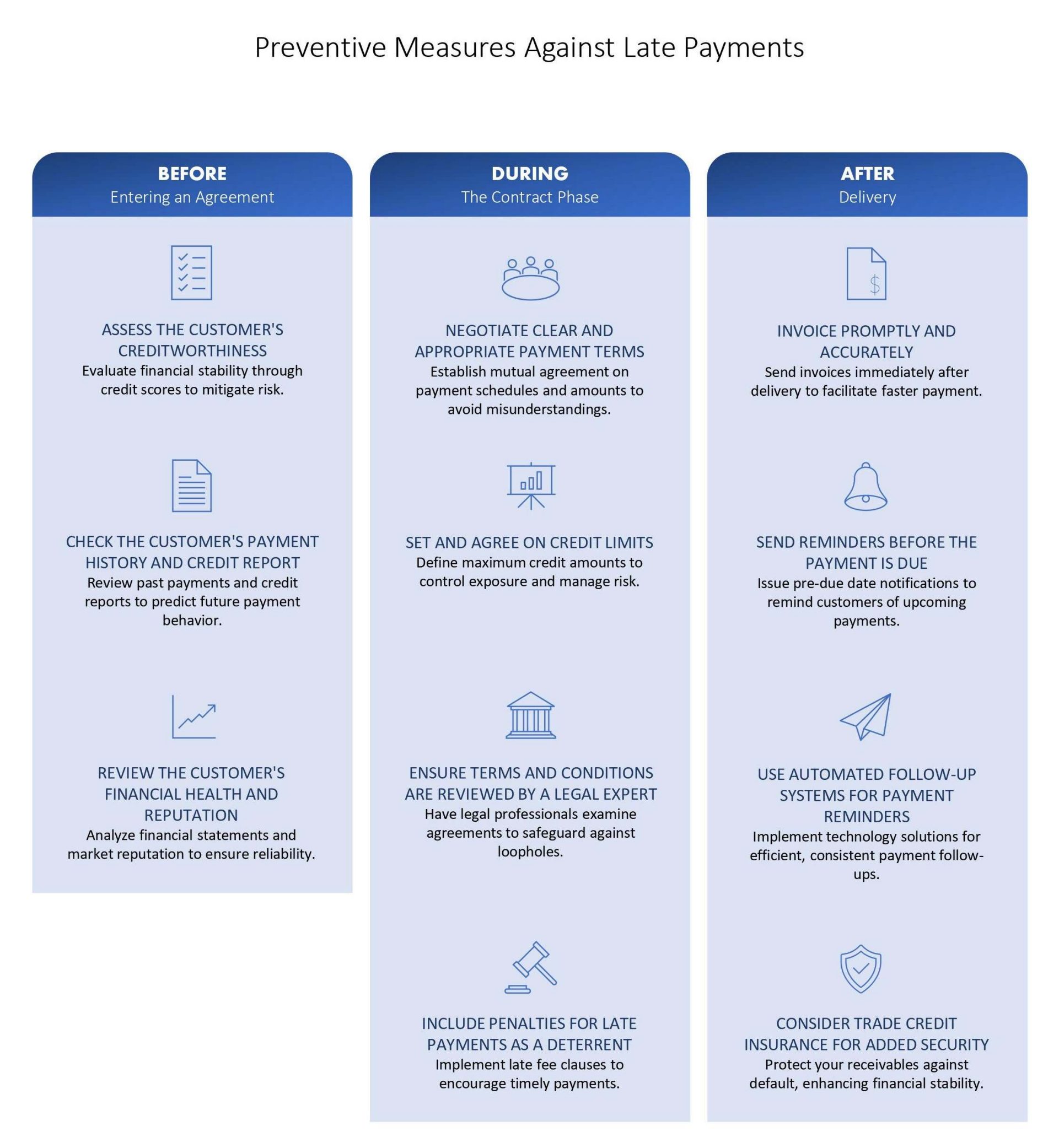To minimize late payments, businesses should assess customers' creditworthiness, negotiate clear payment terms, and have agreements reviewed by legal experts.