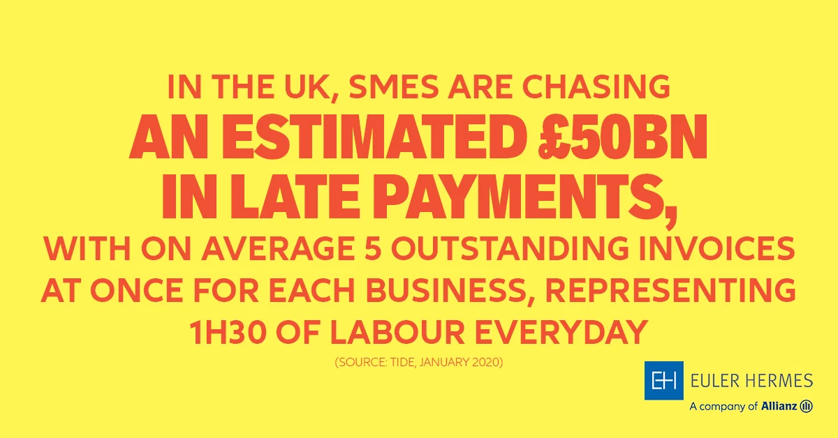 在英国,据估计,中小企业正在追讨约500亿英镑的 逾期付款款项,平均每家企业一次有五张未偿付发票,相当于每天一个半小时的劳动(资料来源:Tide,2020年1月)。