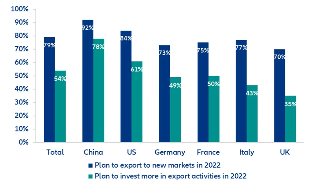 关注中国的人士还需要警惕另一个影响经济前景的下行风险:美中紧张局势。 事实上,美中紧张关系从未真正淡化,在两国均处于政治敏感期的情况下(11月的美国中期选举和中国共产党第二十次全国代表大会),拜登政府有可能对中国产品实施进口配额。 俄乌冲突也可能会进一步助长脱钩势头。 在考虑这一下行风险时,我们需注意强劲的出口表现对中国2020和2021年整体经济作出了推动作用。 根据我们的《 安联贸易全球调查报告》,在俄乌冲突和Omicron变种病毒爆发之前,中国企业对2022年的出口机会和投资意向仍然非常乐观。